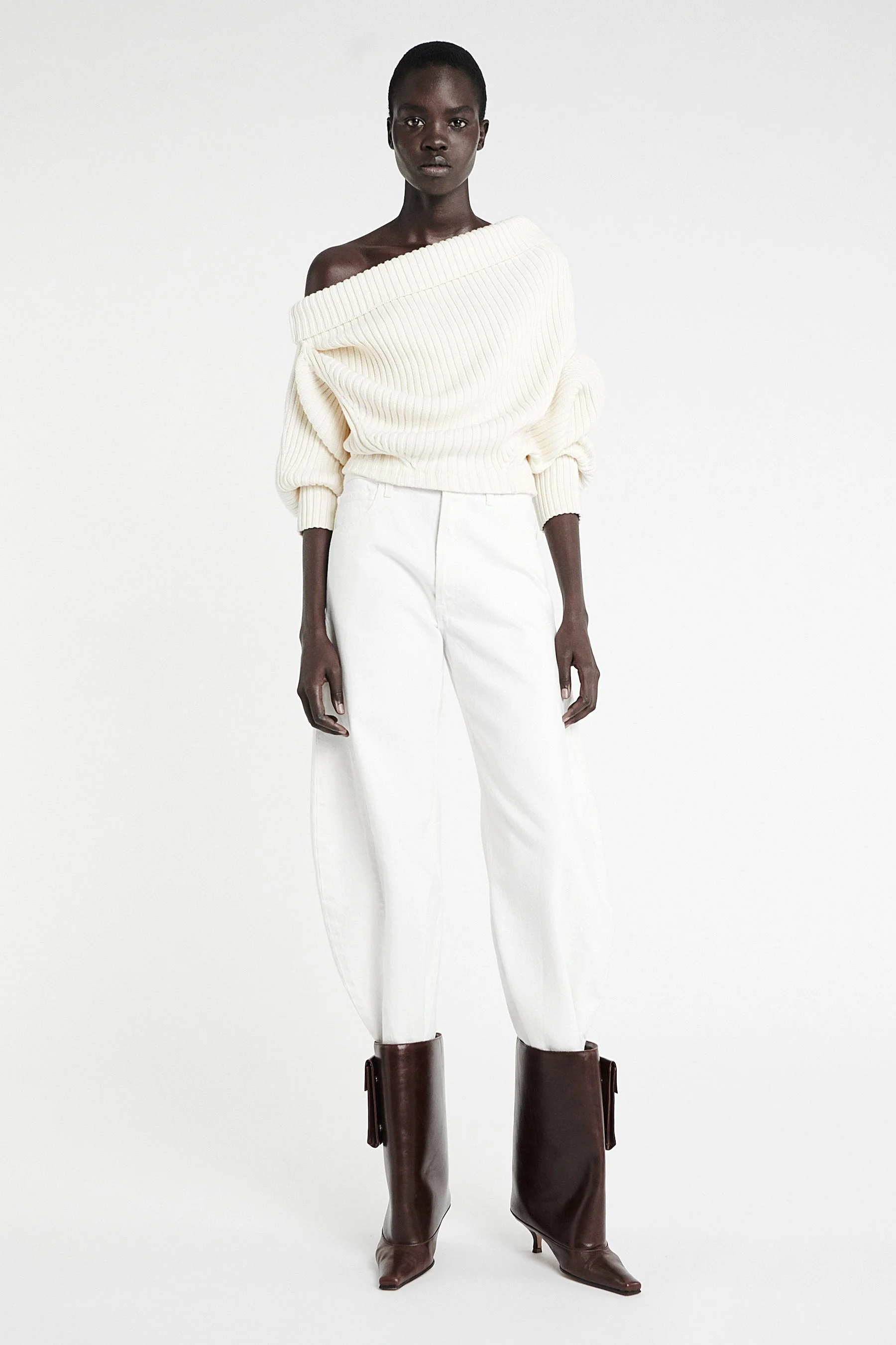 Knitted from a cotton-wool blend, this off-shoulder sweater features a finely ribbed construction. The bodice is designed with an inverted, upside-down effect, offering a relaxed fit at the top and a more fitted shape at the waist. Draped quarter-length sleeves and shoulder details enhance the sculptural silhouette, while a button closure at the back completes the piece with precision. Shown here with Denim Jeans With Inserts White Denim and Dana Sister Ankle Boot Brown. FIT & SIZE - Designed with a relaxed fit at the bust and slim fit around the waist. - True to size, we recommend choosing your regular size. - Model is 181 cm / 5'11" (bust: 74 cm / 29”, waist: 61 cm / 24”, hips: 87 cm / 34½”) and is wearing size XS. PRODUCT DETAILS - 83% Cotton 17% Wool - Heavyweight material. - Button closure. - Unlined. - Dry clean. - Made in Lithuania.