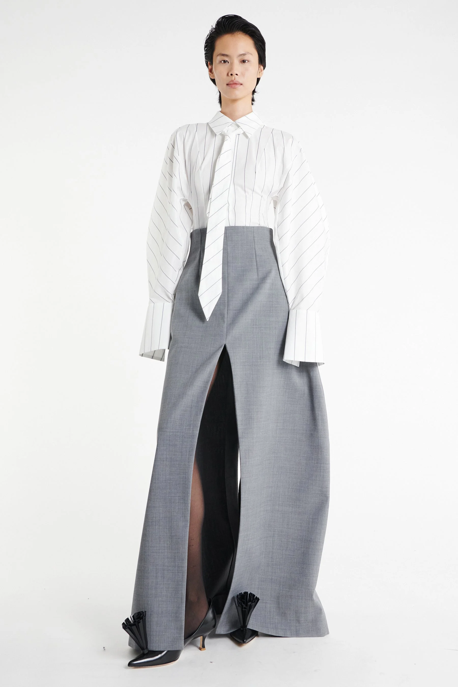 Crafted in a wool-blend suiting fabric, this maxi skirt mimics tailored trousers with a fitted waist, darts and side slip pockets. Front and back splits introduce movement, while the concealed zip at the back maintains clean lines. Shown here with Puff Sleeve Shirt White Stripe and Lea Black. Also shown with Cropped Jacket With Insert Grey. FIT & SIZE - Designed with an oversized fit through the legs. - True to size, we recommend choosing your regular size. - Model is 177 cm / 5'9" (bust: 75 cm / 29”, waist: 60 cm / 23”, hips: 88 cm / 34”) and is wearing a size FR 36. Lookbook model is 176 cm / 5'9" (bust: 77 cm / 30”, waist: 59 cm / 23”, hips: 86 cm / 34”) and is wearing a size FR 36. PRODUCT DETAILS - 55% Polyester 43% Lana 2% Elastan - Heavyweight material. - Invisible zip at the back. - Lined. - Dry clean. - Made in Poland.