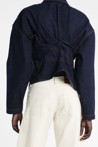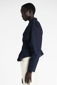 Crafted from rigid denim, this shirt features twist detailing and stitched ruching that contour the torso into a slim silhouette. With a point collar and button-front closure, it balances deconstructed character with tailored precision. Shown here with Denim Jeans With Inserts Ecru Denim. FIT & SIZE - Designed with a relaxed fit at the bust and a slim fit at the waist. - True to size, we recommend choosing your regular size. - Model is 181 cm / 5'11" (bust: 74 cm / 29”, waist: 61 cm / 24”, hips: 87 cm / 34½”) and is wearing size FR 34. PRODUCT DETAILS - 100% Cotton - Midweight material. - Press studs. - Unlined. - Dry clean. - Made in Portugal.