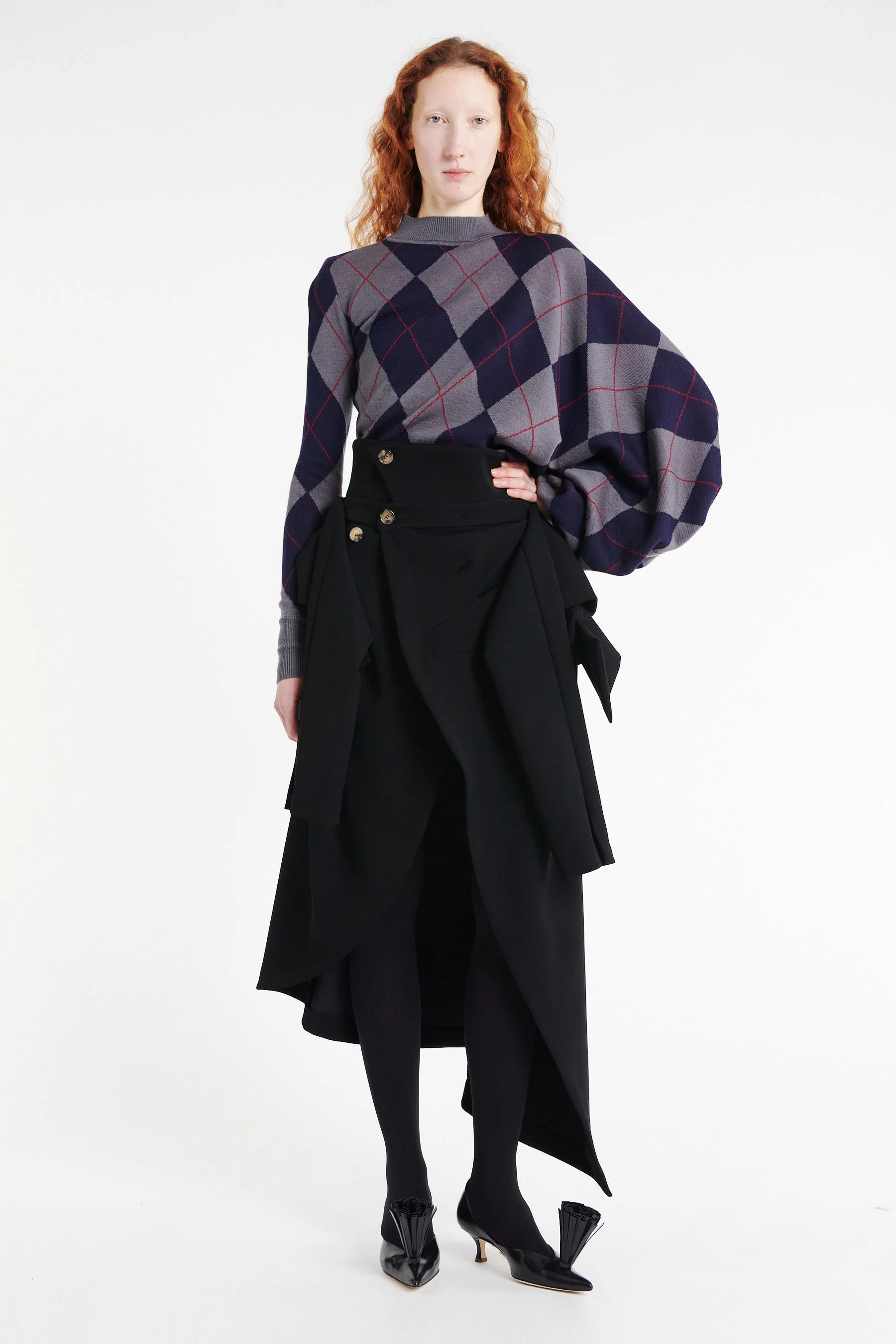 Made from fluid crepe, this asymmetric skirt features a deconstructed sleeve belt at the waist and a folded front lapel. The A-line cut is shaped for generous volume, opening into a high front slit that gives the silhouette a precise yet easy movement. Shown here with Argyle Knitted Top Navy Grey and Lea Black. Available in beige melange. FIT & SIZE - Designed with a high waist and with a slim fit around the waist. - True to size, we recommend choosing your regular size. - Model is 181 cm / 5'9" (bust: 81 cm / 31”, waist: 61 cm / 24”, hips: 89 cm / 35”) and is wearing a size FR 36. PRODUCT DETAILS - 95% Polyester 5% Elastane - Heavyweight material. - Button closure. - Unlined. - Dry clean. - Made in Lithuania.