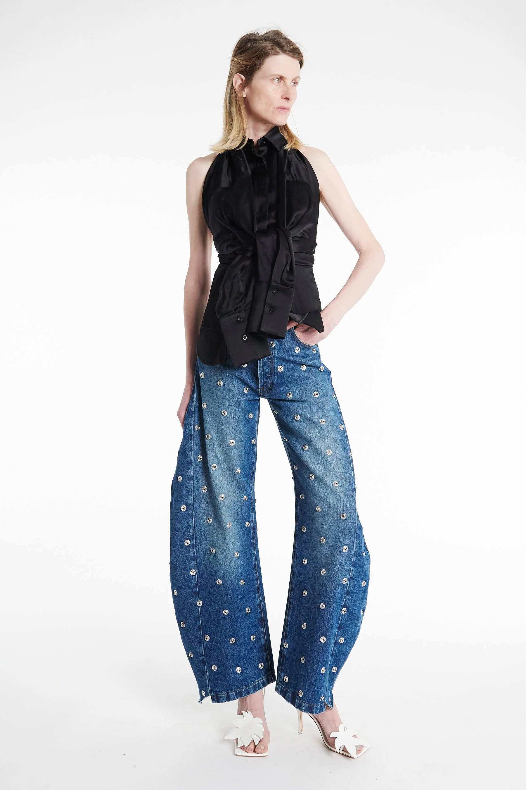 Cut from organic, non-stretch denim, these jeans feature a sculptural balloon-leg construction and are punctuated with silver-tone grommet studs. Shown here with Deconstructed Shirt Halterneck Top Black and Delta Palma White. FIT & SIZE - Designed with a mid-rise waist. - True to size, we recommend choosing your regular size. - Model is 175 cm / 5'9" (bust: 84 cm / 33’’, waist: 65 cm / 25½’’, hips: 87 cm / 34½”) and is wearing a size FR 36. PRODUCT DETAILS - 100% Regenerated Cotton - Dry clean. - Made in Paraguay.