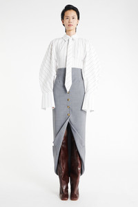 Tailored in a clean, structured silhouette, this skirt features a buttoned front with no slits for a streamlined finish. A jacket-style collar placed at the hem introduces an unexpected architectural detail, creating a subtle trompe-l'œil effect. Shown here with Puff Sleeve Shirt White Stripe and Christy Boot Brown. Available in beige melange. FIT & SIZE - Designed with a high waist and slim fit. - True to size, we recommend choosing your regular size. - Model is 177 cm / 5'9" (bust: 75 cm / 29”, waist: 60 cm / 23”, hips: 88 cm / 34”) and is wearing FR 34. PRODUCT DETAILS - 75% Polyester 20% Wool 3% Polyurethane 2% Elastane - Midweight material. - Button closure. - Unlined. - Dry clean. - Made in Lithuania.