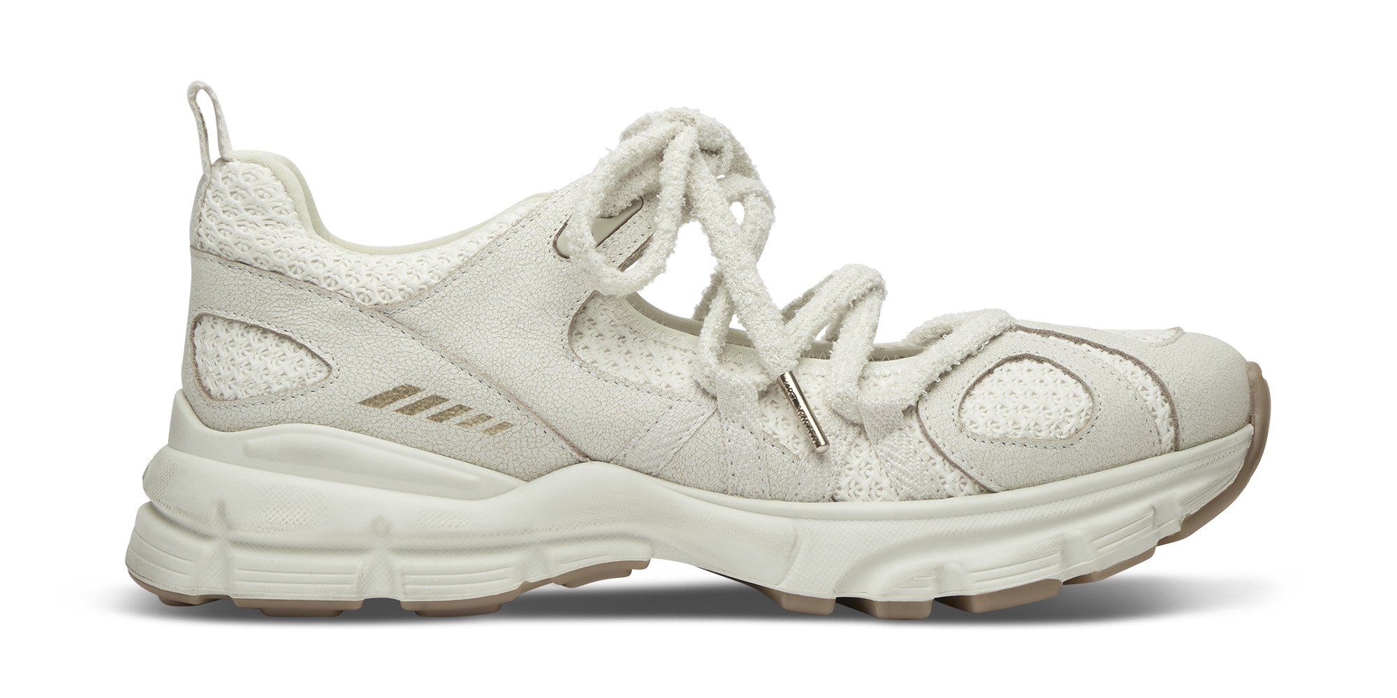 The Marathon Ballet combines a cutout upper and chunky tread sole for a distinctive silhouette. Handcrafted in Portugal, this model has a knitted profile detailed with cracked leather overlays and features fluffy laces that crisscross over the open top. Style Details - Upper: 50% Leather + 50% Recycled Polyester - Lining: 73% Polyester + 14% Elastane + 13% Microfiber - Sole: 100% TR; heel height measuring 35mm - European Sizing - Transfer detail - Herringbone heel webbing with embroidered branding - Flat fluffy laces - Handmade in Portugal