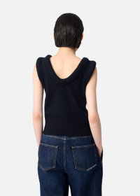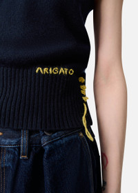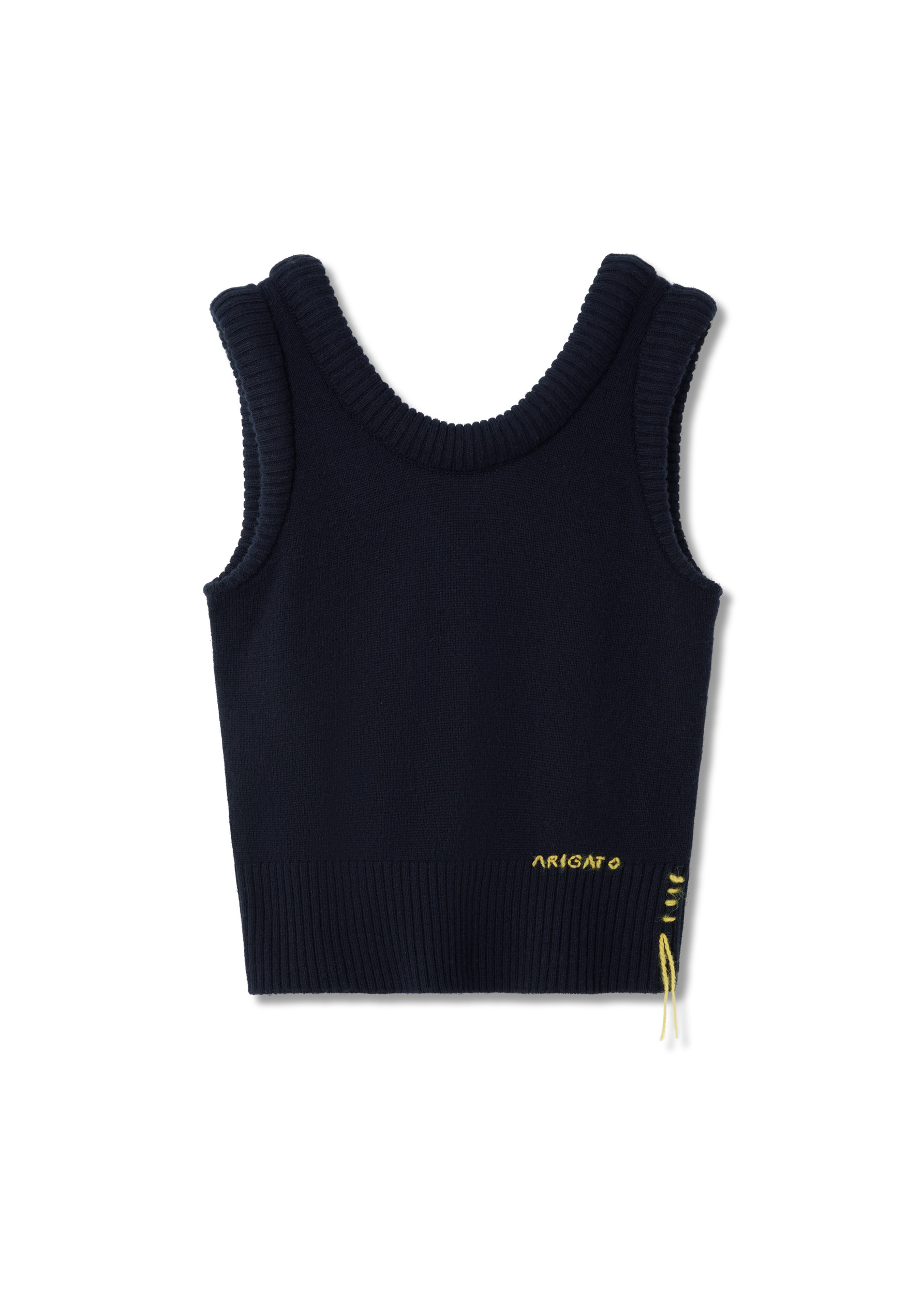 Knitted from a soft wool-blend, the Marla vest is padded around the neckline and armholes to create subtle volume in the slim silhouette. Looped hand-stitching and embroidery finish this piece. This item is made from carefully selected, high-quality yarns. Due to the fabric’s nature, pilling may occur and will gradually lessen over time. It can be removed with a pilling comb. Handle with care to preserve the original appearance of this piece for as long as possible. The model is 170 cm / 5’7” ft and wears a size XS. Style Details - 50% Wool 50% Polyamide - Slim fit - Padded ribbed neckline and armhole - Hand embroidered loop stitching detail - Hand embroidered 'Arigato' logo at bottom hem - Can be worn back to front - Crafted in China - Care instructions: Hand wash cold