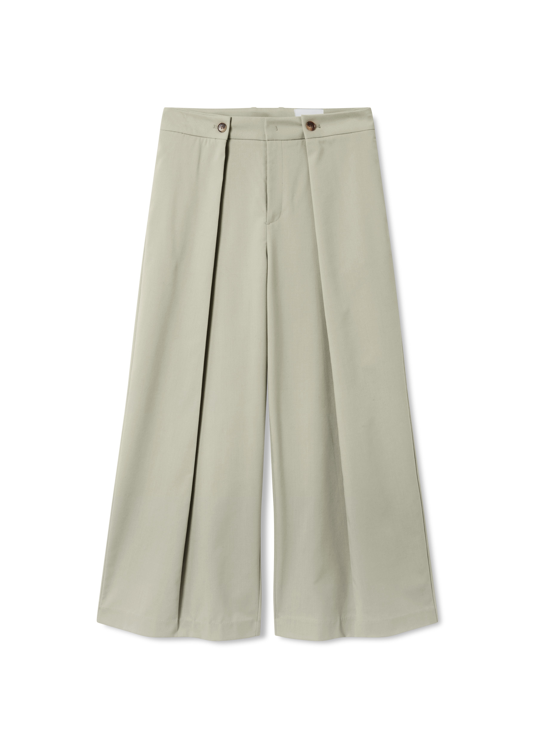 Tailored with touches of soft wool, the Riley trousers have a loose silhouette detailed with buttoned pleats. Tonal embroidery details the back pocket. This item is made from a wool-blend. Due to its fragile nature, we recommend handling it with care. In order to preserve its unique look and feel, avoid exposing it to abrasive surfaces. The transfer of fibers may occur if it is placed near other garments. Style Details - 35% Wool 63% Polyester 2% Spandex - Loose Leg - Front pleat detail fastened with buttons - Side Pockets - Zip fly closure with hook & bar fastening - Tonal embroidery at back pocket - Back welt pockets - Belt loops - Crafted in China - Care instructions: Dry Clean Only