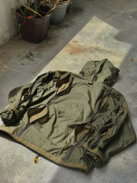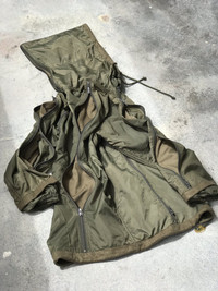 Kosuke Tsumura was born in Japan in 1959. He joined the Miyake Design Studio in 1983 for a decade. During his career he presented his work in eight different moments and won numerous awards. In 1994 Tsumura presented this survival jacket. The first name that was given to this particular garment was “FINAL HOME”; later it became its brand name. Tsumura wondered himself “If I lose my home due to a disaster, war, unemployment, etc…What kind of clothes can I propose as a fashion designer?”. Designed to be a wearable shelter, this parka features 44 pockets designed to store food, medicine and tools. If weather gets cold, the pockets can be filled with newspaper or any other insulating material. All the pockets can also be accommodated with down cushions, transforming the Final Home parka into a down jacket. The parka is made to suit any body shape by simply filling certain pockets with extra materials to provide fitted look. Measurement : Xs on tag but will fit to L/XL Armpit to armpit = 24inches Length = 27.5Inches Sleeve Length (from Shoulder) = 22.5inches Condition : Used.Good Vintage condition. Small stain PLEASE REFER PIC CAREFULLY! All measurements are taken with the garment flat on the ground