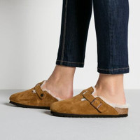Details - Slip on irresistible warmth with these soft and toasty shoes - Classic suede upper is timeless, and hides the slipper-soft lining - Shearling offers incredible cushion, moisture-wicking, and warmth - Natural cork footbed is contoured to support your step - Suede strap can be adjusted and secured for a perfect fit - EVA sole is grippy and absorbs shock - Item runs small, so we recommend sizing up for best fit - Item #BRK000W Tech Specs Upper Material: suede Lining: shearling Closure: adjustable strap, buckle Last: medium/narrow Midsole: cork, latex Sole: EVA Claimed Weight: [single, size 38] 8.7oz