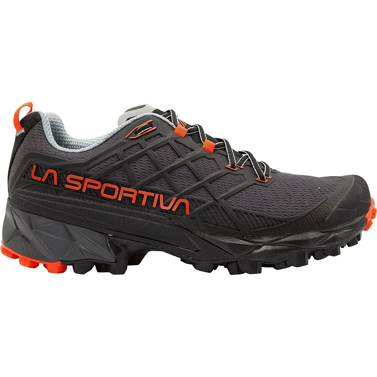 La Sportiva crushes it in the climbing category, so it's no surprise that the Akyra II Hiking Shoe comes up clutch when we're fastpacking in the mountains. This trail shoe features La Sportiva's sticky yet hardwearing Frixion XT 2. 0 rubber compound for plenty of stick-um in the rocks, as well as Impact Brake System lugs at the toe and heel for serious bite on the ups and downs. The medial and lateral Flex Guard midsole inserts bring torsional stability for an increase of power and efficiency on uneven terrain, while the KPU 3D Grid exo-skeleton enhances midfoot support and toughens this shoe up for extended off-road use. Although the Akyra II has the armor and braces of a hiking shoe, it remains light and nimble like a trail runner to keep us both protected and quick on the trail.