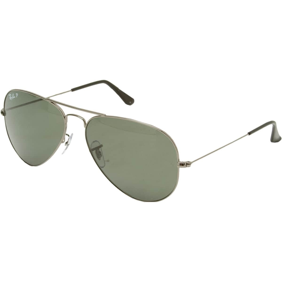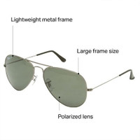 The Ray-Ban Aviator Large Metal Polarized Sunglasses feature the same shape originally developed for fighter pilots over 70 years ago and the added clarity of glare-reducing polarization. The timeless look works whether you’re buzzing the control tower in your F-14, or pulling over motorists for going three mph over the speed limit on the highway to the danger zone. Details - Embrace your inner fighter pilot with these casual aviators - Polarized lenses buck glare and block UV rays - Lightweight metal frame with nose and temple pads - Large frame fits medium-to-large face sizes - Included carry case protects lenses from scratches - Item #RBN0006 Tech Specs Lens: G-15 Polarized: yes Frame: metal Nose/Temple Pads: yes Case Included: yes Face Size: large Base Curve: 6 Frame Dimensions: [lens/bridge/temple] 50 x 58 / 14 / 135mm Manufacturer Warranty: 1 year
