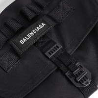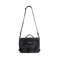 Army Messenger Bag in black recycled nylon PRODUCT DETAILS • Dimensions : L8,8 x H7,2 x W3,5 inch • Messenger bag • One top handle • Two hooks • Ajustable and removable nylon strap • Flap closure with buckle • Balenciaga logo patch embroidered on front • One inner zipedp pocket • One inner patch pocket • Inner press botton closure • Magnetic patch pocket on the sides • Back zip pocket • Cotton canvas lining • Made in Italy • Wipe with a soft cloth Material: 70% polyamide, 30% polyester