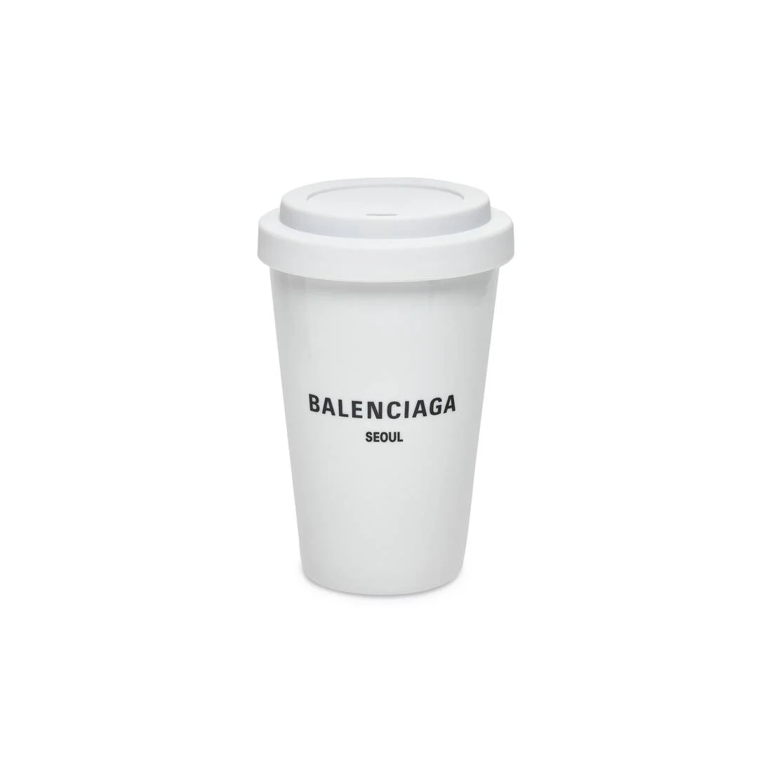 Cities Seoul Coffee Cup in white porcelain PRODUCT DETAILS • Dimensions: H5,1 x Ø3,5 inch • Capacity : 30 cl • Porcelain • Balenciaga logo at front • 1 lid made of thermoplastic elastomer • Made in China • Hand wash • The porcelain cup can be heated in a microwave oven but not the lid Material: 100% porcelain - 83 % TPE, 17% polypropylene