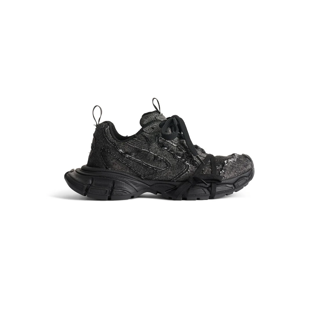 3XL Sneaker in black denim PRODUCT DETAILS • Cotton • Sneaker • Worn-out effect • Balenciaga logo at the edge of the toe and at back • Printed size on the upper and at the back of the heel • 3XL branding ptinted on the tongue • Back and tongue pull-on tab with reflective detail • Caution: extra laces are tied around the shoes for styling purpose and should be removed before use • Made in China Upper: cotton - Sole: rubber, EVA - Insole: foam