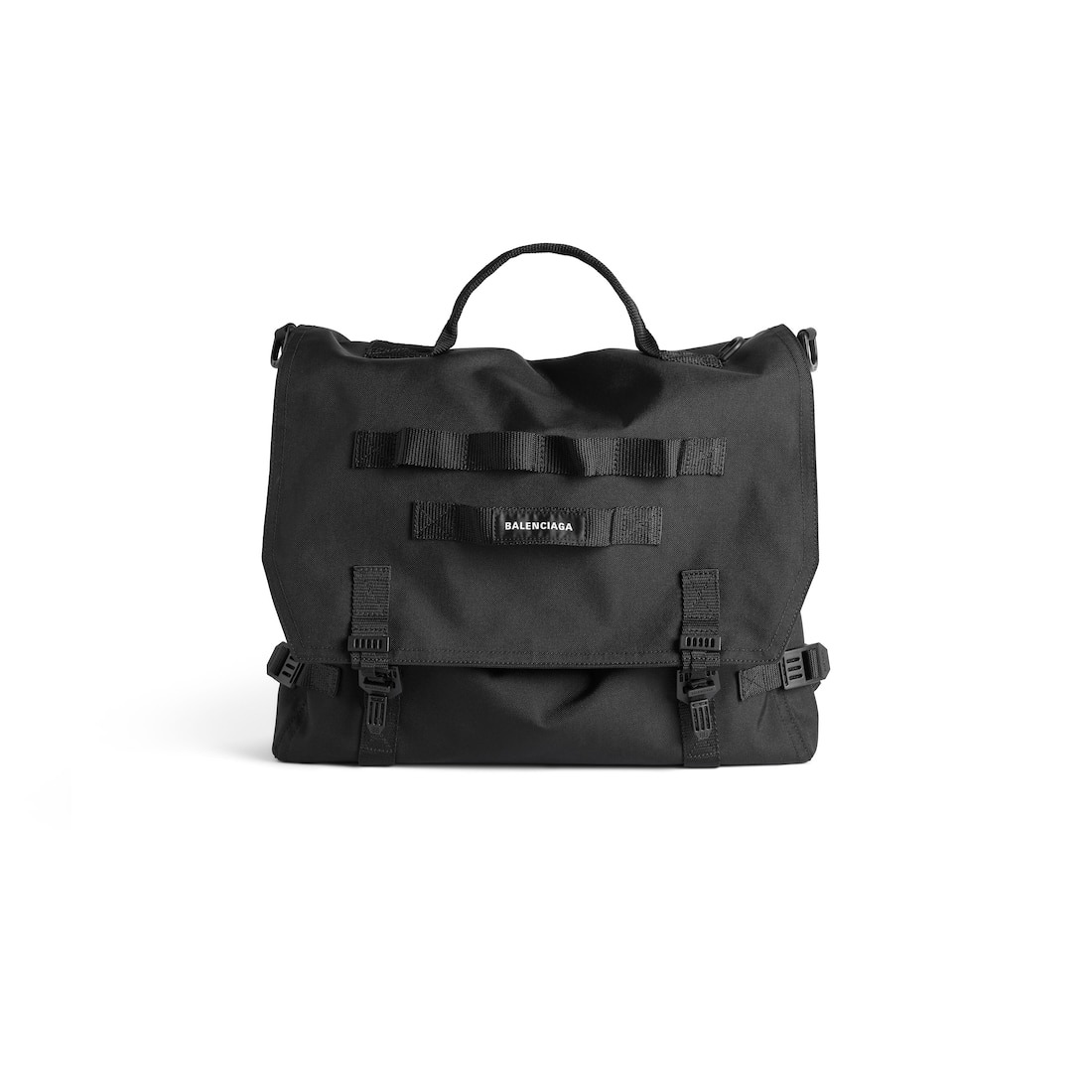 Army Messenger Bag in black recycled nylon PRODUCT DETAILS • Dimensions : L16,1 x H11,8 x W5,5 inch • Reycled casual nylon • Messenger bag • Flap closure with buckle • Top Handle • Ajustable and removable nylon strap • One inner compartiment • Inner zip pocket • Inner patch pocket • Inner press botton closure • Magnetic patch pocket on the sides • Back zip pocket • Front nylon details • Front Balenciaga patch • Ajustable straps on the sides • Made in Italy • Wipe with a soft cloth Material: 100% polyamide