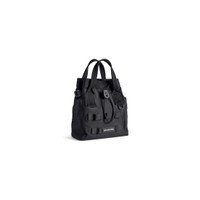 Army Small Tote Bag in black recycled nylon PRODUCT DETAILS • Dimensions : L9 x H10,6 x W4,7 inch • Recycled nylon • Small tote bag • Two handles • Adjustable and removable strap (18,5 inch) • Balenciaga logo patch at front • Tone-on-tone hardware • MOLLE loop system with one hook • Drawstring closure • Magnetic patch pocket on each side • Cotton canvas lining • Made in Italy • Wipe with a soft cloth Material: 100% polyamide