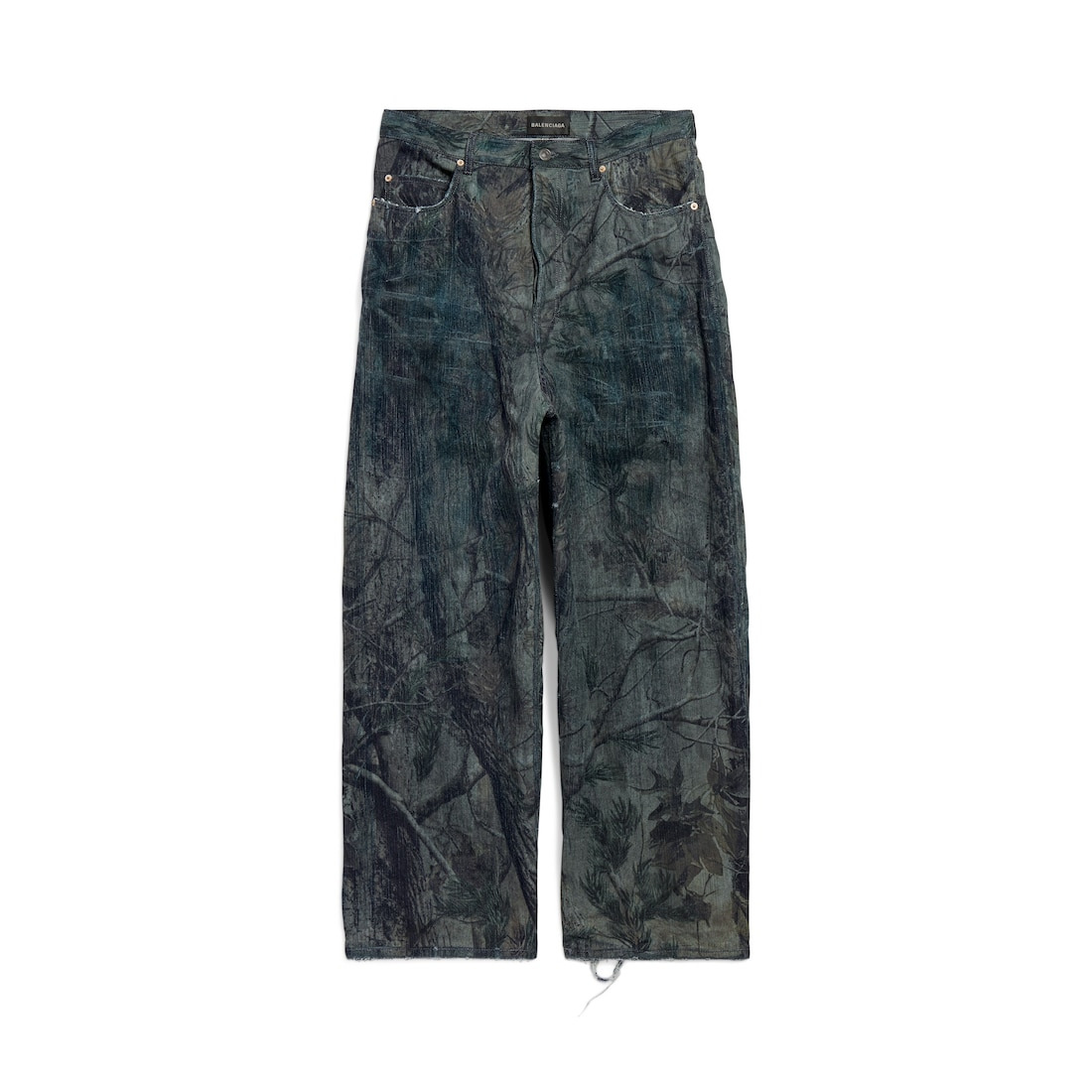 Baggy Pants in brown Feuillage Camo cotton denim for Men PRODUCT DETAILS • Feuillage Camo cotton denim • Mid-waist • Covered button fly • 5 belt loops • 5 pockets • Balenciaga engraved flex buttons • Balenciaga Jeans jacron at back • Made in Italy Main material: 100% cotton