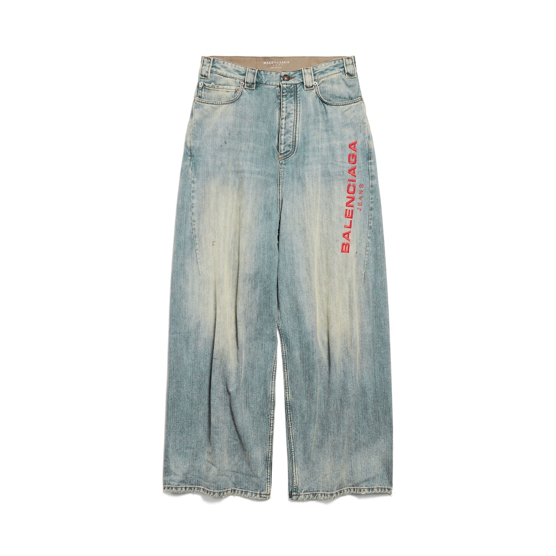 Baggy Pants in light blue Italian ring denim PRODUCT DETAILS • Italian ring denim • Mid-waist • Covered button fly • 5 belt loops • 5 pockets • Balenciaga engraved flex buttons • Balenciaga Jeans embroidered on left leg • Balenciaga Jeans jacron at back • Destroyed effect at back legs • Made in Italy Main material: 100% cotton