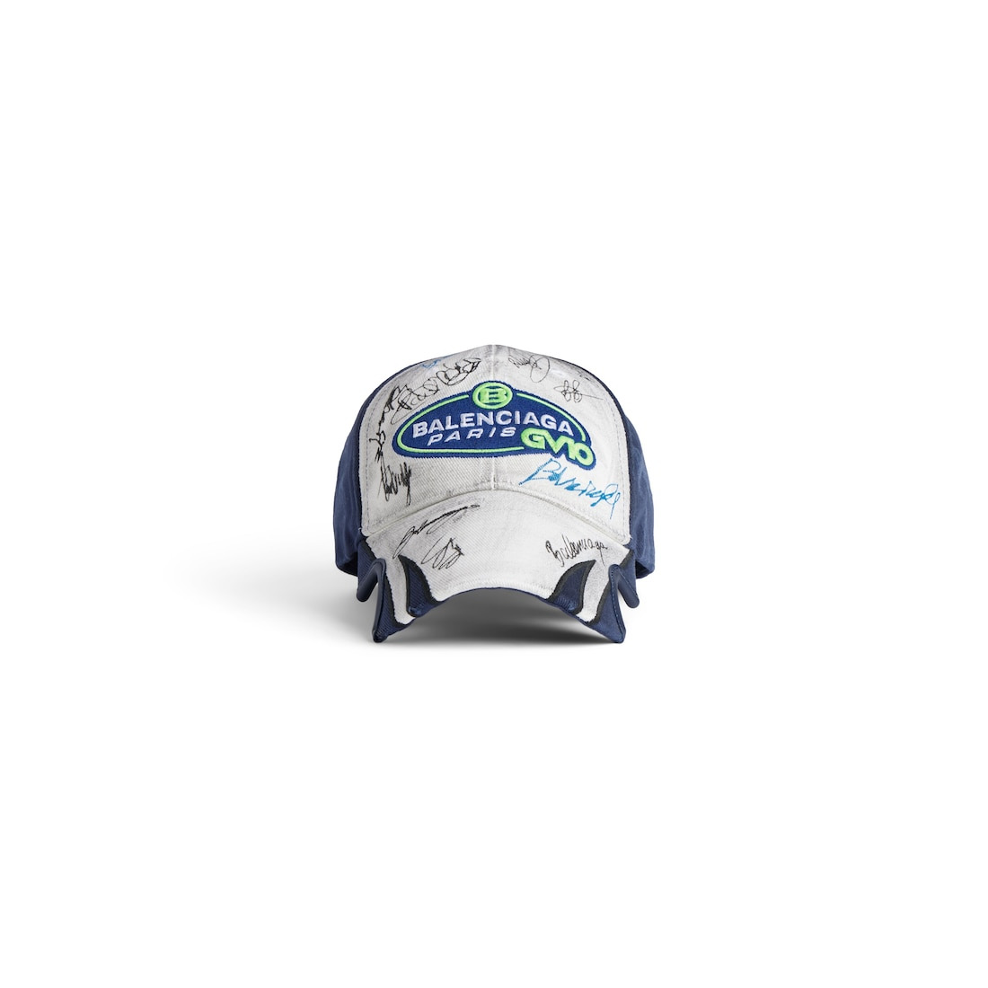 Banana Cap in dirty white and blue cotton drill PRODUCT DETAILS • Cotton drill • Worn-out details • Classic baseball cap shape • Ventilation eyelets embroidered on top • Adjustable hook and loop tab at back • Visor cut out on both sides • Banana artwork embroidered and pinted at front • Made in Italy Main material 1: 100% cotton