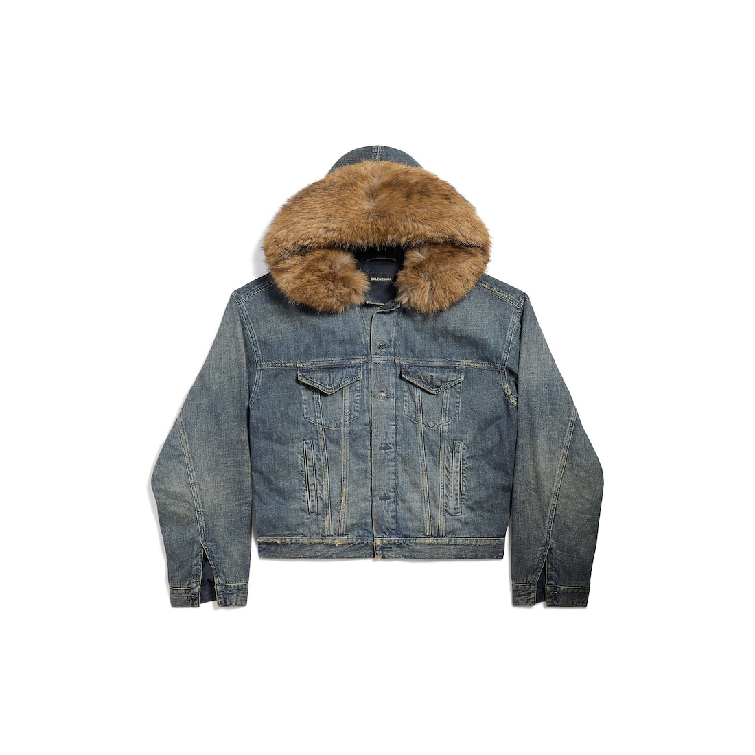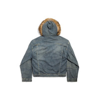 Boxy Denim Jacket in blue cotton denim for Men is from look 38 of Balenciaga Winter 25 Collection. PRODUCT DETAILS • Cotton denim • Hooded with animal-free fur detail • Dropped shoulders • 6 button-front • 2 chest pockets • 2 slash pockets • Buttoned cuffs • Adjustable buttoning at waist • Balenciaga engraved flex buttons • Made in Italy Main material 1: 100% cotton