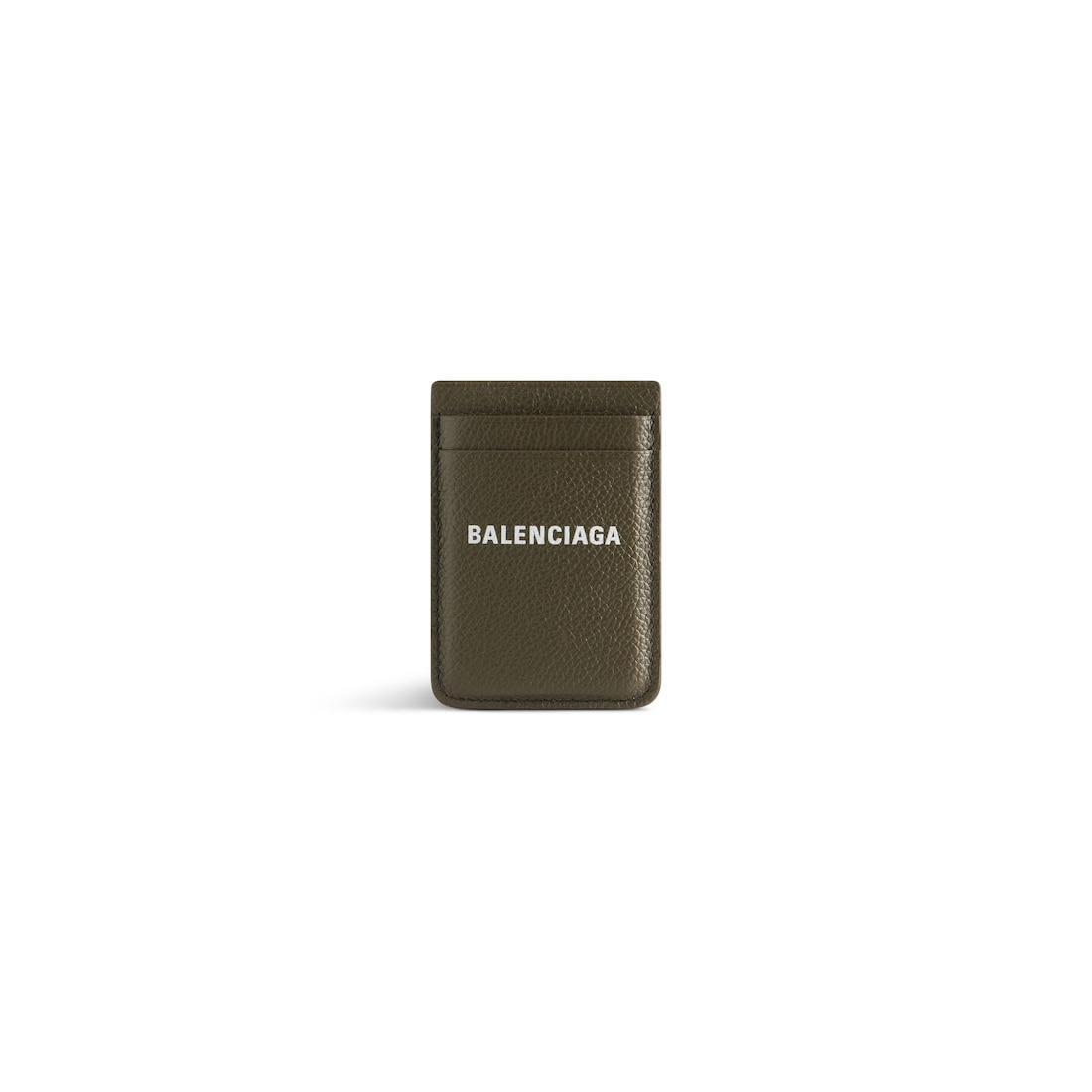 Cash Magnet Card Holder in dark green and white grained calfskin PRODUCT DETAILS • Dimensions: L2,6 x H3,7 x W0,2 inch • Grained calfskin • Card holder to attach to the back of the phone • Balenciaga logo printed at front • 2 card slots • Made in Italy • Wipe with a soft cloth Material: 100% calfskin
