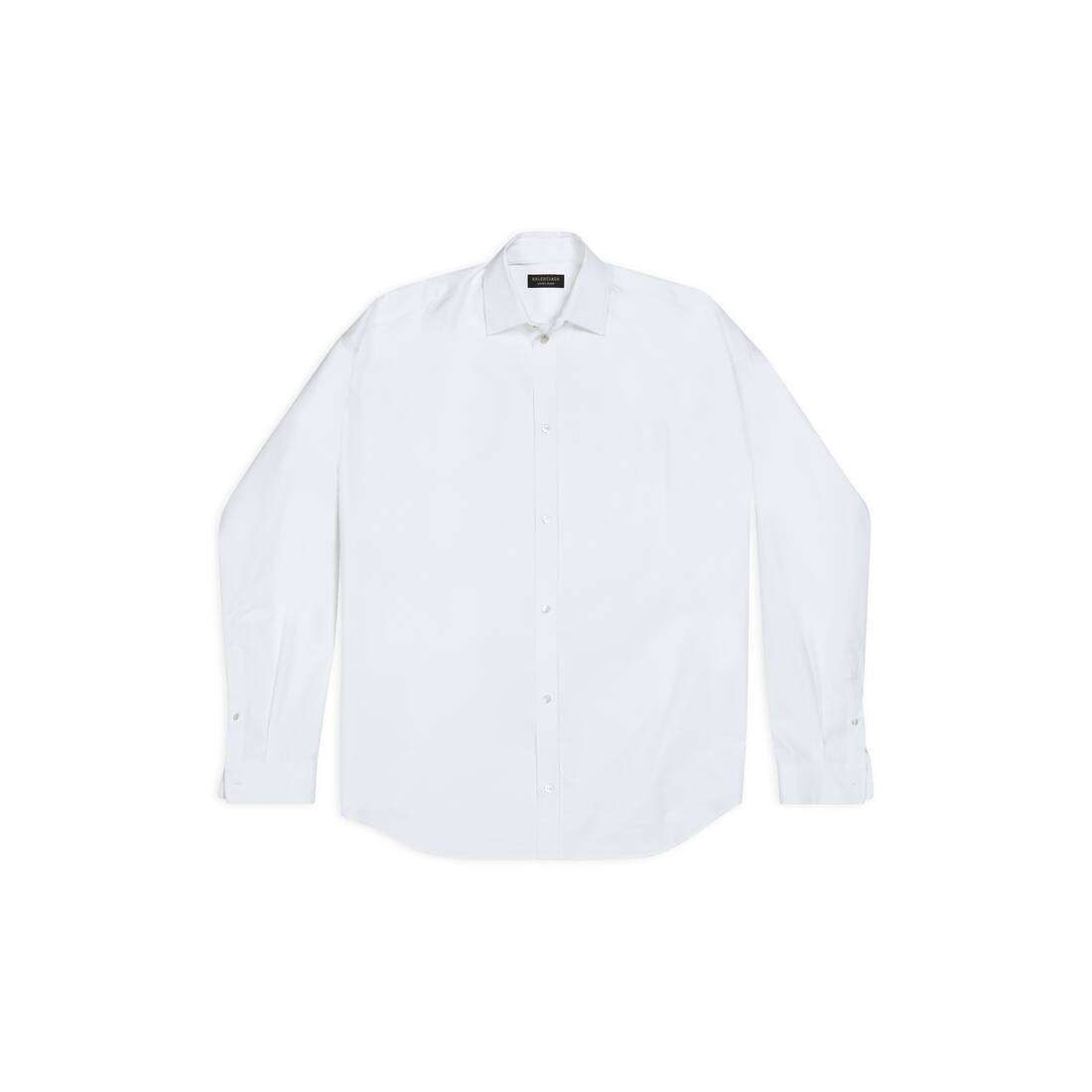 Cocoon Shirt in white poplin PRODUCT DETAILS • Poplin • Cocoon fit • Button-down collar • Dropped shoulder • 7 button front • 1 patch pocket at chest • Long sleeves • Buttoned cuffs • Rounded bottom • Balenciaga engraved buttons • Made in France • Dry cleaning • Model is 185 cm / 6'1'' and is wearing a size 38 Material: 100% cotton