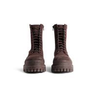 Combat Strike 20mm Boot in dark brown cotton canvas PRODUCT DETAILS • Cotton • Lace-up boot • Extra round toe • Washed and worn-out effect • 20mm arch • Inner zip • Visible top-stitching • 11 eyelets lace-up vamp • Thick toothed rubber outsole • Balenciaga logo in the front and in the back • Made in Italy Upper: cotton - Sole: TPU, bio-based TPU, polyurethane - Insole: calfskin