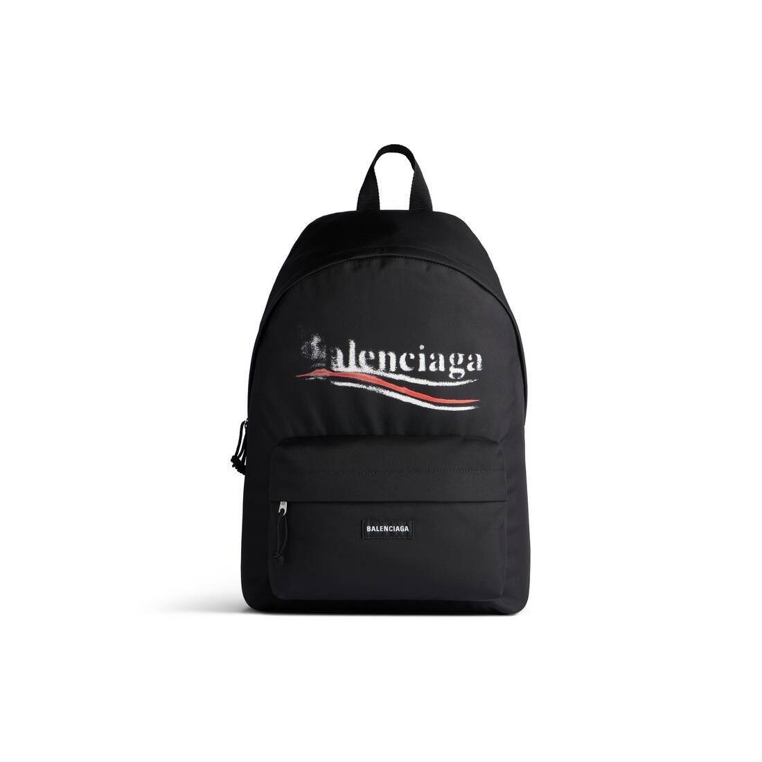 Explorer Backpack in black recycled nylon PRODUCT DETAILS • Dimensions: L13,7 x H18,5 x W7,8 inch • Nylon • Backpack • One top handle • Adjustable shoulder straps • Political stencil logo printed at front • Balenciaga logo patch at front • Matte black hardware • Top double-ended zip-fastening closure • Front zipped pocket • 1 inner zipped pocket • 1 inner patch pocket • BB logo engraved zipper puller with cotton string • Cotton canvas lining • Made in Italy Material: polyamide, polyester
