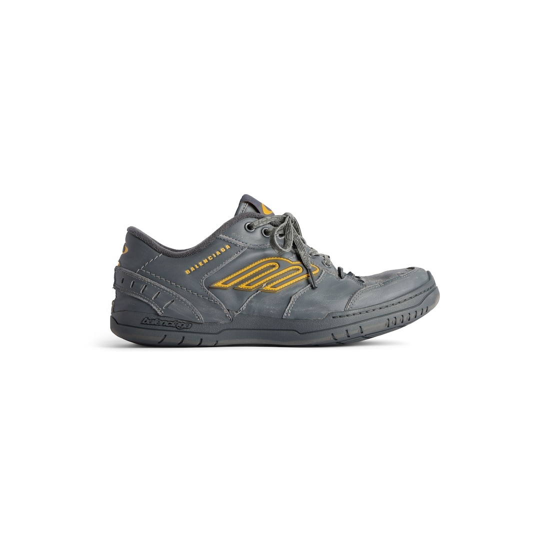 Hamptons Worn-Out Sneaker in grey and yellow cowskin and polyester PRODUCT DETAILS • Cowskin and polyester • Sneaker • Worn-out effect • Scribbled laces • Raw edge and visible stitching on the upper • Balenciaga logo debossed on the upper • Balenciaga logo embossed on the outsole • 3B sports icon artwork in rubber on each side • Loop sports icon logo on the tongue and at back heel • Written size debossed on the upper and at back of the heel • Made in China Upper: cowskin, polyester - Sole: rubber - Insole: foam