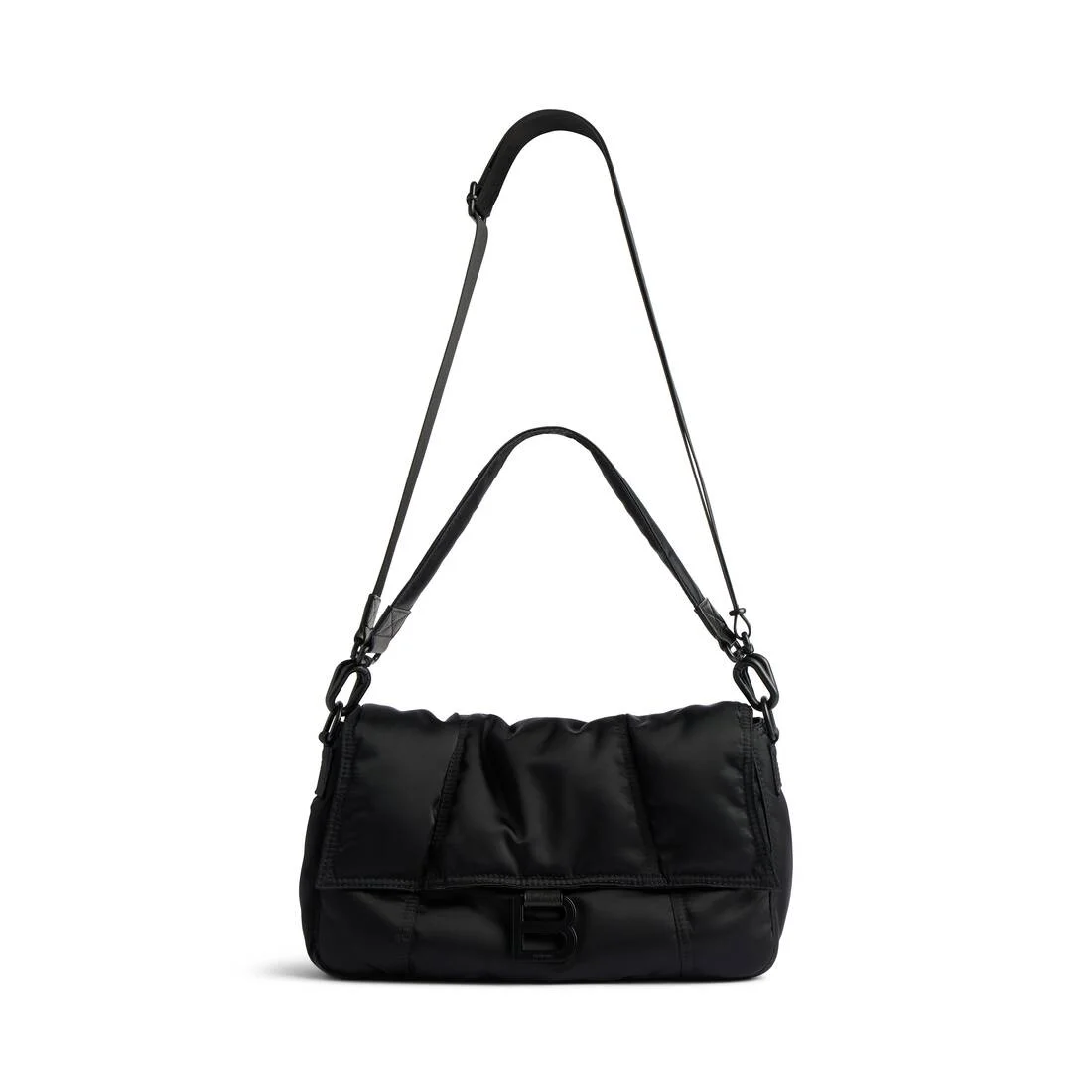 Hourglass Board Bag Medium in black nylon, matte black hardware PRODUCT DETAILS • Dimensions: L12,6 x H8,8 x W3,9 inch • Polyamide, polyester and lambskin • Removable shoulder strap (drop: 6,7 inch) • Adjustable and removable crossbody strap (drop: 19,7 inch) • Matte black B logo hardware • Studded magnet closure • 1 main compartment • 1 inner zipped pocket • 1 flat pocket at back • Polyamide lining • Made in Italy Material: polyamide, polyester, lambskin