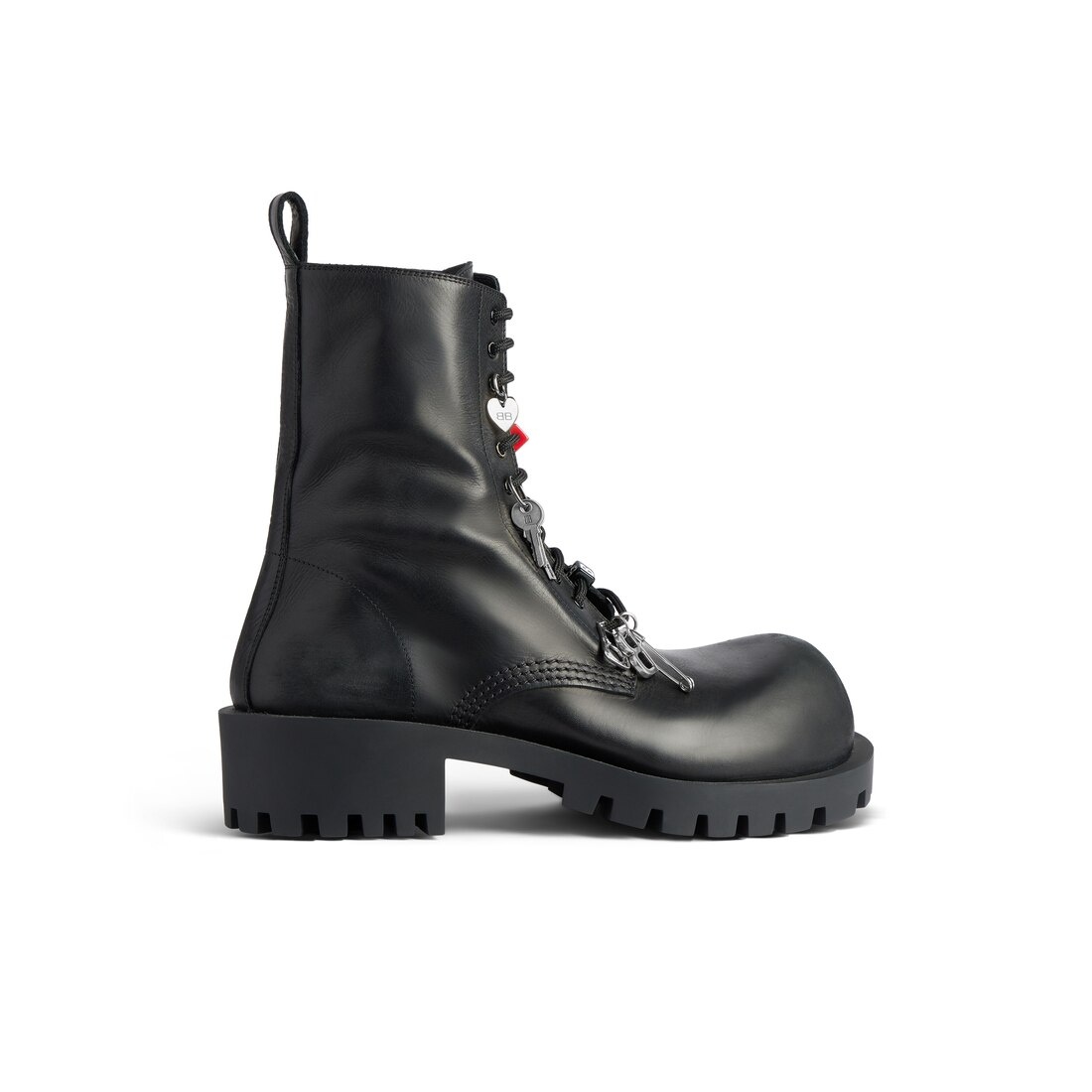 Hummer Lace-Up Bootie in black soft bullskin with charms PRODUCT DETAILS • Soft bullskin with charms • Lace-up bootie • Chunky design • Worn-out effect • 50mm heel height • 30mm arch • Lightweight material • Inner zipped closure • 11 eyelets lace-up vamp • Slightly asymmetrical rounded toe • Thick toothed outsole • Loop at back • Made in Italy Upper: bullskin - Sole: TPU - Insole: calfskin