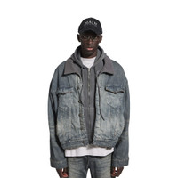 Layered Lined Denim Jacket in blue cotton for Men PRODUCT DETAILS • Cotton denim, dry fleece and terry fleece • Trompe l'œil, layered construction: Denim jacket on hoodie • Panels sewned together • Terry fleece collar • Dry fleece hood with drawstring • Zipped front • 5 decorative button front • 2 chest pockets • 2 slash pockets • Adjustable buttoning at waist • Balenciaga engraved flex buttons • Made in Italy Main material 1: 100% cotton
