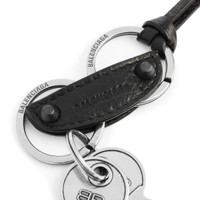 Le City Charm/Keychain in black lambskin PRODUCT DETAILS • Arena lambskin • Keychain with charms • One thin leather cord • Balenciaga logo debossed tone-on-tone at front • BB and Balenciaga logo engraved • 2 split rings • Brass hardware and aged-silver hardware • Can be attached to the bag or be used as a keychain • Made in Italy Material: lambskin
