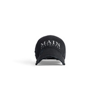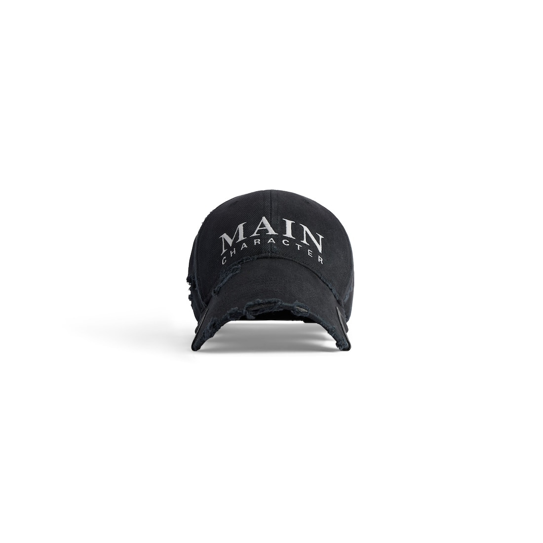 Main Character Artwork Cap in faded black cotton drill is from look 25 of Balenciaga Winter 25 Collection. PRODUCT DETAILS • Cotton drill • Classic baseball cap shape • Ventilation eyelets embroidered on top • Adjustable hook and loop tab at back • Visor cut out on both sides • Main character artwork embroidered at front • Destroyed, worn-out details • Made in Italy Main material: 100% cotton