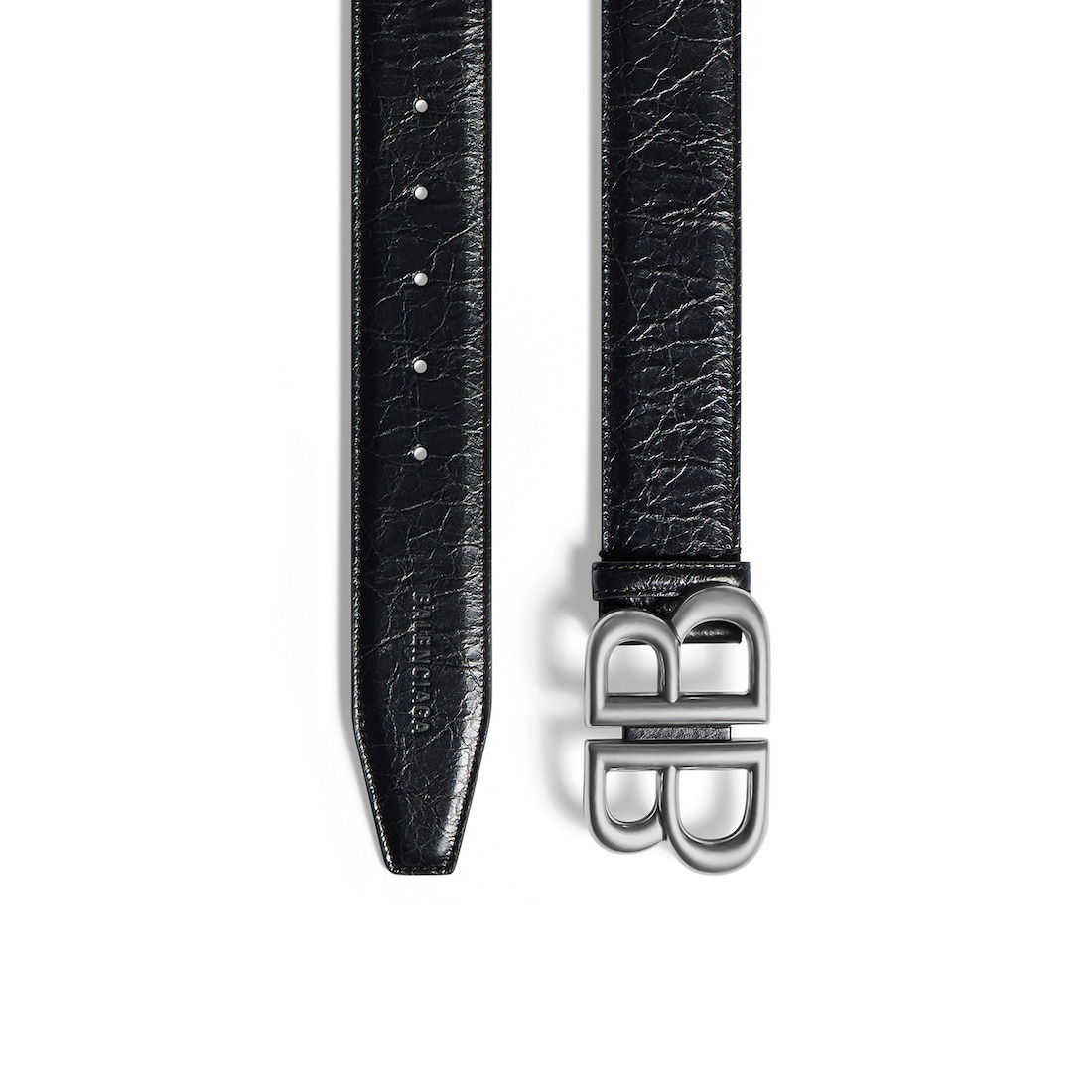 Monaco Belt in black Arena calfskin, aged-silver hardware PRODUCT DETAILS • Dimensions: Width: 1,6 inch • Arena calfskin • Balenciaga logo embossed tone-on-tone at end tip • Aged-silver BB logo hardware • 20 notches on the belt • Tone-on-tone leather loop • Made in Italy • Wipe with a soft cloth Material: 100% calfskin