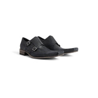 Monsieur Monk Derby in black worn-out calfskin is in several looks of Balenciaga Winter 25 Collection. PRODUCT DETAILS • Calfskin • Monk derby • 30mm arch • Worn-out effect on the sole and on the upper • Elongated and square toe • Two buckles on the upper • Balenciaga logo engraved on each buckle • Made in Italy Upper: calfskin - Sole: calfskin - Insole: calfskin