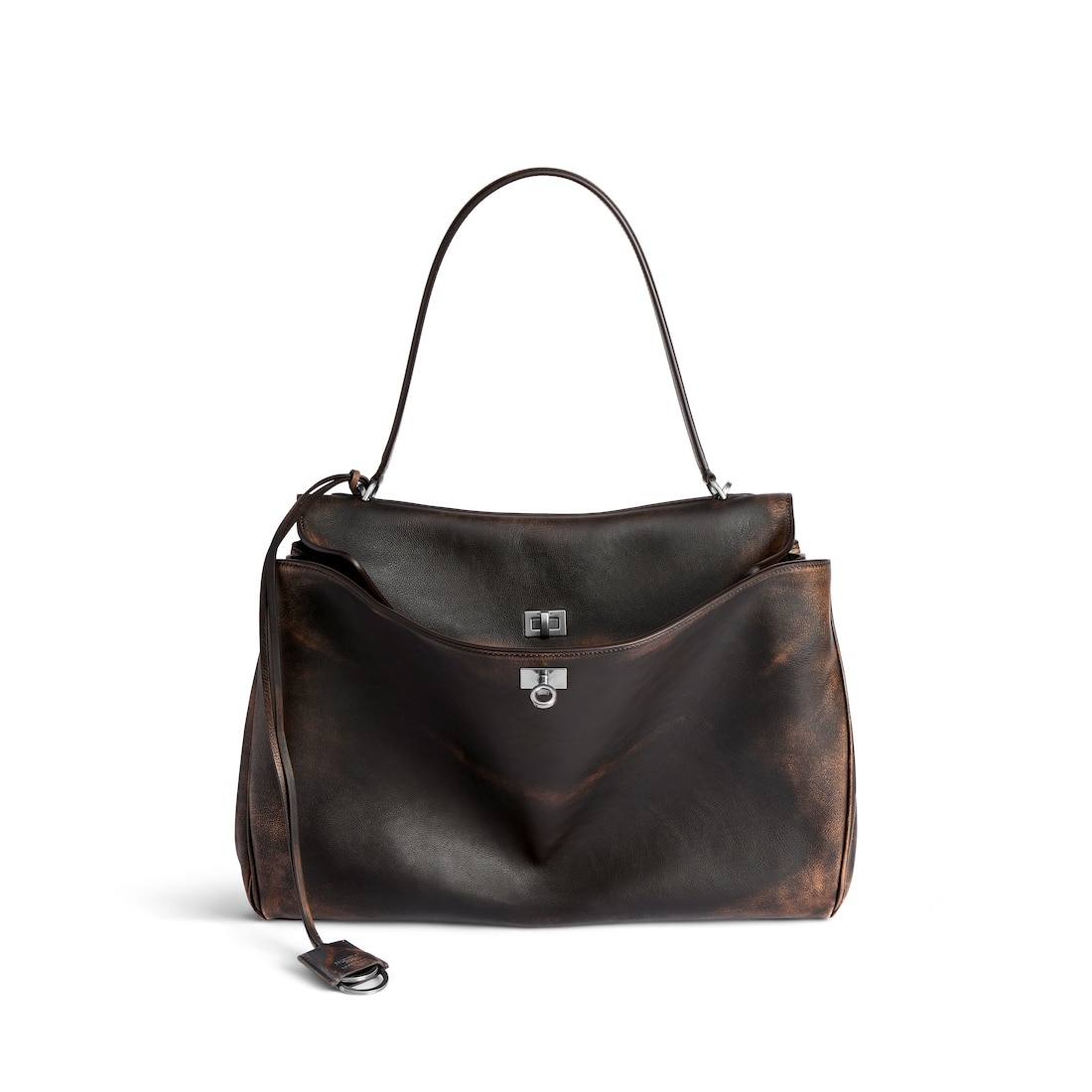 Rodeo Handbag Large in light brown and dark brown bitonal used effect calfskin, aged-silver hardware PRODUCT DETAILS • Dimensions: L15,7 x H11,8 x W5,1 inch • Bitonal used effect calfskin • Handbag • One handle (drop: 9 inch) • Removable shoulder strap (drop: 22,4 inch) • Removable cloche cles with two split rings • Aged-silver hardware • Turn lock closure • Wide front pocket • 1 main compartment • 1 inner zipped pocket • 2 flat pockets at back • Side snaps • 4 brass feet • Nappa lambskin lining • Made in Italy Material: calfskin, polyester