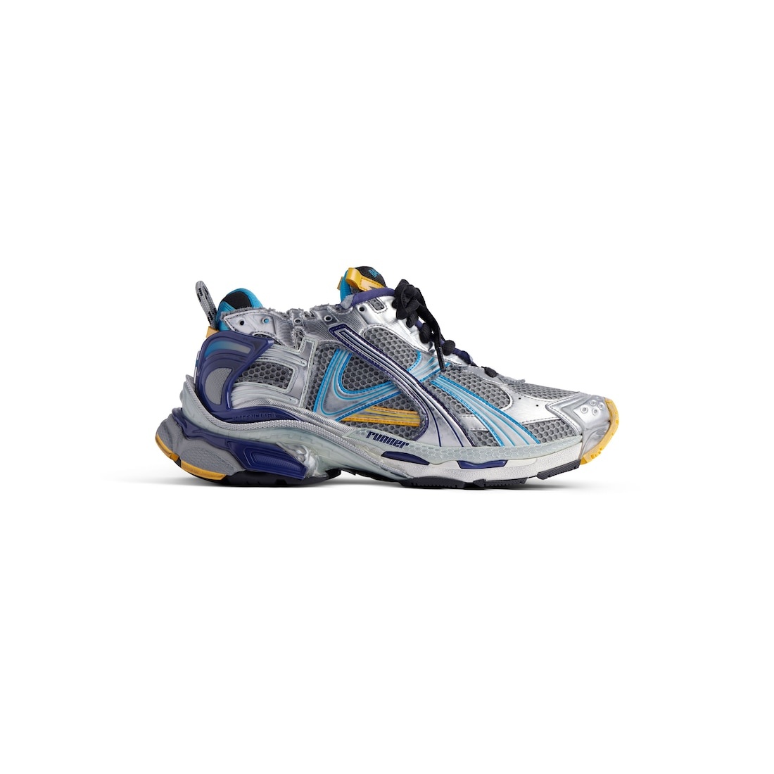Runner Sneaker in grey, blue, orange and aqua mesh, polyurethane and polyester PRODUCT DETAILS • Leather free • Sneaker • Polyurethane and polyester • Worn-out effect • Printed size at the edge of the toe • Debossed size at back • Runner logo printed on exterior • Balenciaga logo embroidered on the tongue • Balenciaga logo at the back of the heel • Back pull-on tab • Made in China Upper: polyurethane, polyester - Sole: rubber, TPU, EVA, polyurethane - Insole: foam