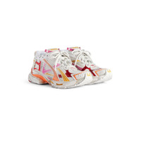 Runner Sneaker in white, orange, pink and red polyurethane and polyester PRODUCT DETAILS • Leather free • Sneaker • Polyurethane and polyester • Worn-out effect • Printed size at the edge of the toe • Debossed size at back • Runner logo printed on exterior • Balenciaga logo embroidered on the tongue • Balenciaga logo at the back of the heel • Back pull-on tab • Made in China Upper: polyurethane, polyester - Sole: rubber, TPU, EVA, polyurethane - Insole: polyester