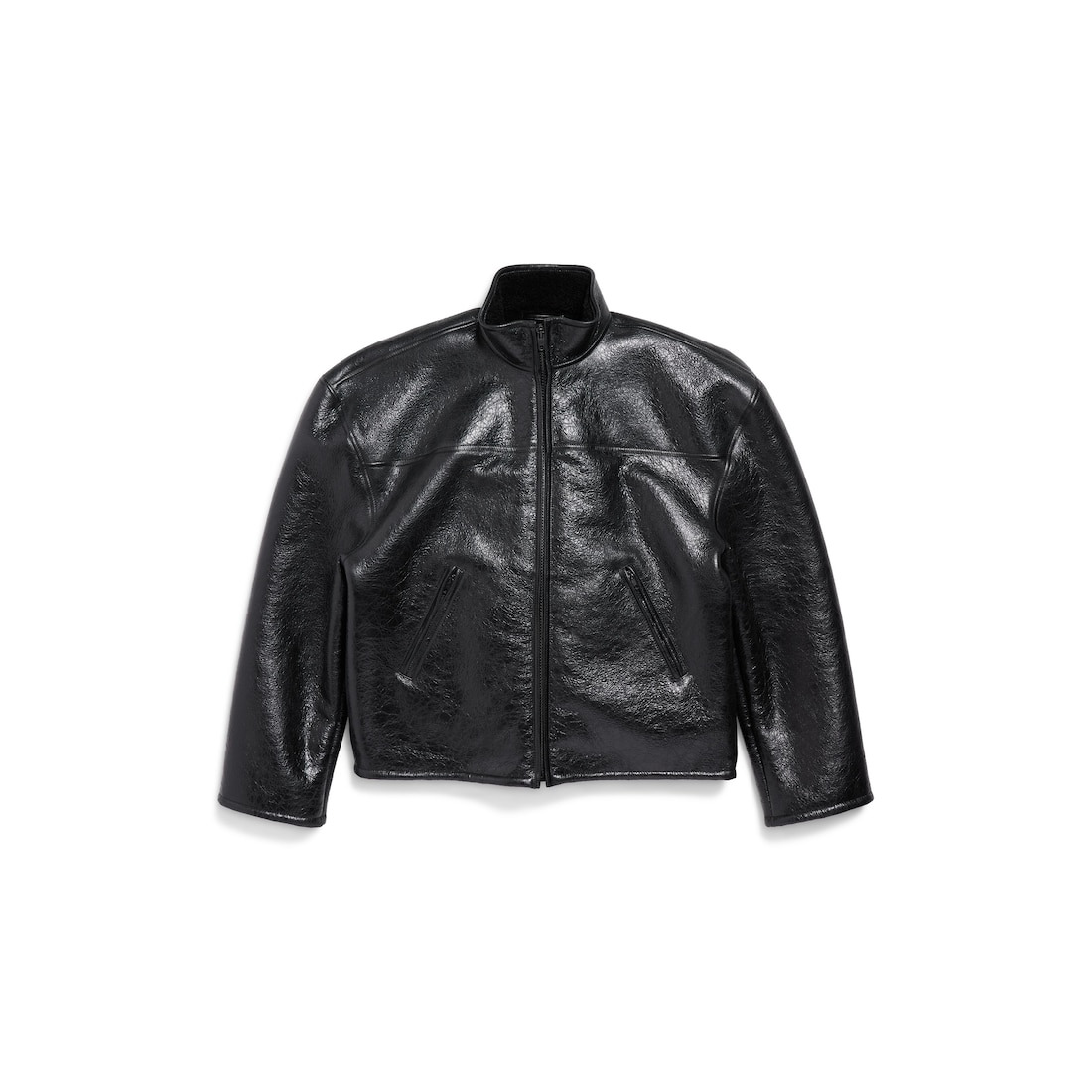 Shearling Zip-Up Jacket in black semi-shiny leather PRODUCT DETAILS • Semi-shiny lambskin • Lambskin shearling lining • Wide, rounded shoulders • High collar • Zipped front • Wide sleeves • Zipped sleeves • 2 front zip pockets • Made in Turkey Main material: Lambskin
