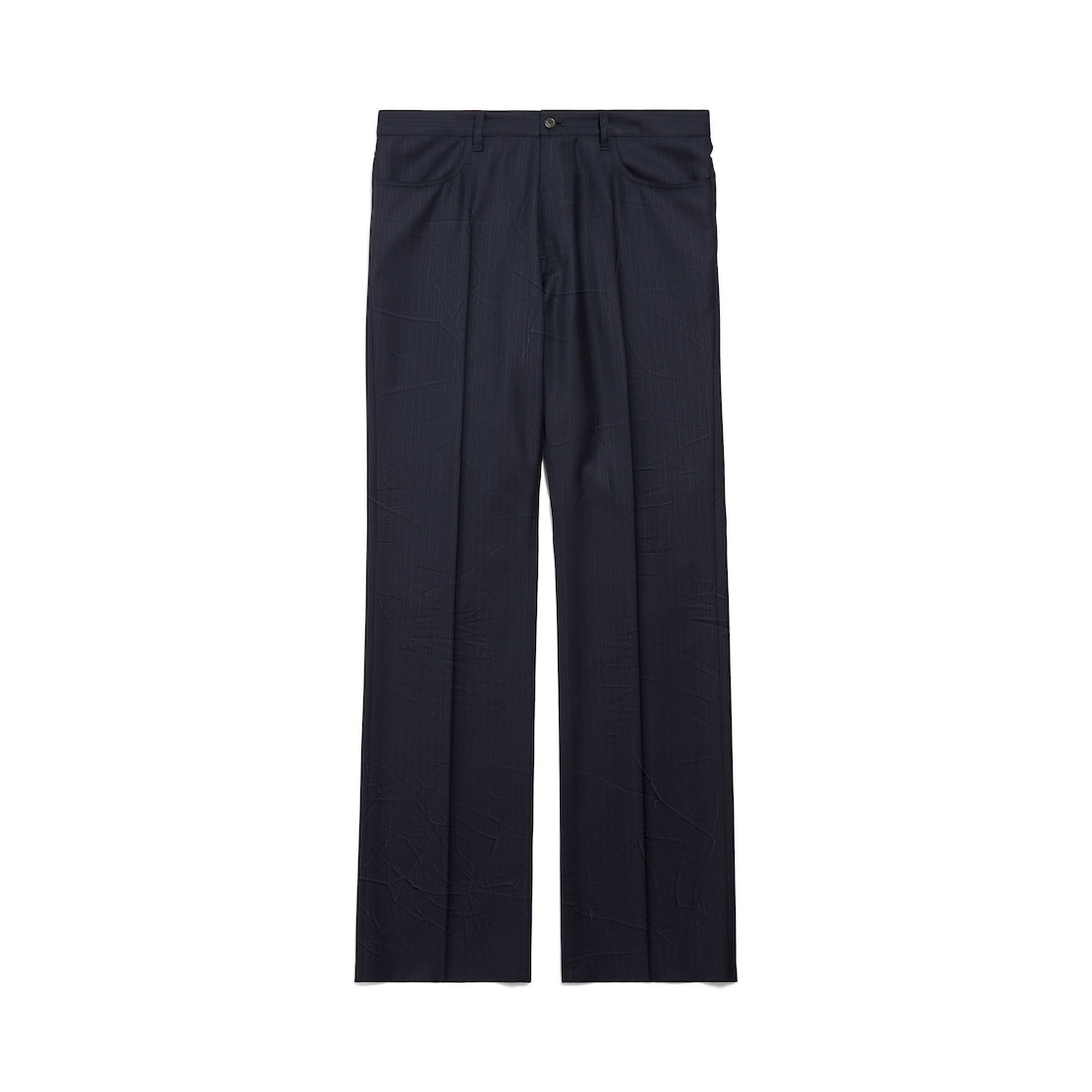 Straight Tailored Pants in dark navy pinestripe fine wool for Men are from look 3 of Balenciaga Winter 25 Collection. PRODUCT DETAILS • Pinestripe fine wool • Mid-waist • Covered zip fly • 5 belt loops • 2 slash pockets at front • 1 buttoned pocket at back • Creased leg • Made in Italy Main material: 100% wool
