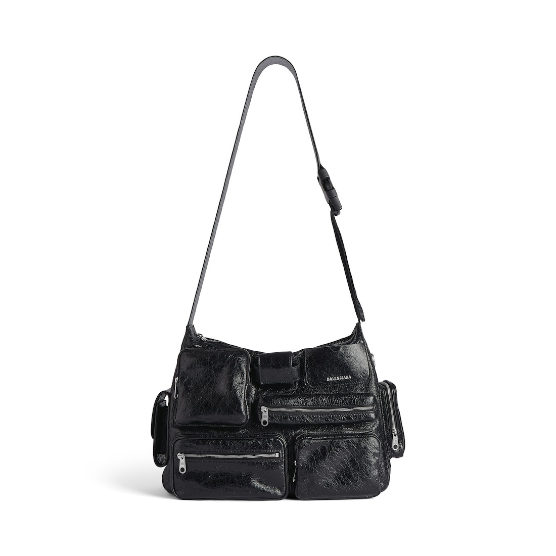 Superbusy Messenger Bag in black Arena lambskin, aged-silver hardware PRODUCT DETAILS • Dimensions: L13 x H9,8 x W3,9 inch • Arena lambskin • Messenger bag • Adjustable shoulder strap (drop: 15,7 inch) • Balenciaga logo debossed with silver foil at front and back • Aged-silver hardware • Zipped closure • 1 main compartment • 4 zipped pockets at front • 1 EarPods case to fit AirPods Pro at front • 1 card holder at front • 1 flap pocket and 1 zipped pocket on sides • 1 zipped pocket at back • 2 D rings • BB logo engraved on zipper puller • Cotton canvas lining • Made in Italy • Wipe with a soft cloth Material: 95% lambskin, 5% polyester