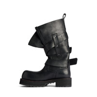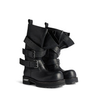 Venom High Boot in black calfskin PRODUCT DETAILS • Calfskin • High boot • Extra round toe • 20 mm arch • Worn-out effect • Wide gusset at front • Adjustable straps with belt buckles • Balenciaga and 10 AV George V 75008 Paris logo debossed on the upper • Plate with Balenciaga logo engraved on exterior outsole • Thick toothed rubber outsole • Loop at back • Made in Italy Upper: calfskin - Sole: micro, TPU, calfskin, zamac - Insole: calfskin