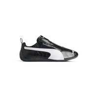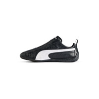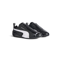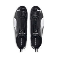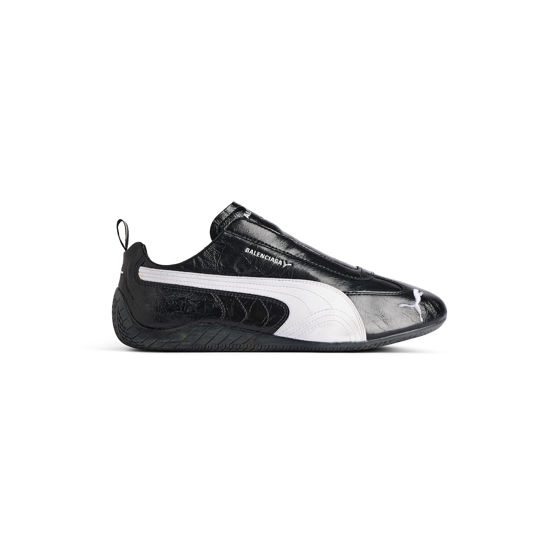Speedcat Leather Balenciaga in black and white cowskin PRODUCT DETAILS • Cowskin • Slip-on sneaker • Flat and smooth upper construction • Balenciaga logo and PUMA cat debossed on the tongue and external side • Embroidered PUMA cat on the front • In collaboration with PUMA • Written size on the back of the heel • Back pull-on tab with reflective detail • Made in China Upper: cowskin- Sole: rubber - Insole: polyester