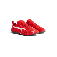 Speedcat Suede Balenciaga in red, white and black distressed suede cowskin PRODUCT DETAILS • Distressed suede cowskin • Sneaker • Flat and smooth upper construction • Balenciaga logo and PUMA cat in gold foil on the tongue and external side • Embroidered PUMA cat on the front • Written size on the back of the heel • In collaboration with PUMA • Back pull-on tab with reflective detail • Made in China Upper: cowskin - Sole: rubber - Insole: polyester