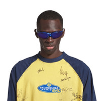 Turbo D-Frame Sunglasses in blue bio-based injected nylon, with mirror blue lenses PRODUCT DETAILS • Temple length: 5,12 inch • Bridge length: 0,52 inch • Bio-based injected nylon frame and temples (65% bio-based) • D-frame shape • Smart fit • Flexible metal hinge • Metal plate with BB logo on center-front of the frame • Balenciaga logo engraved on the left top rim • Lens material: Bio-Nylon • Lens category: 2 • 100% UVA/UVB protection • Not suitable for optical conversion • Made in Italy • BB0464S Material: polyamide