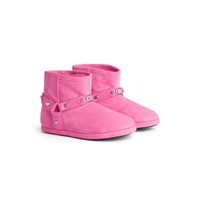 Alaska Soft Bootie in dark pink split calfskin and synthetic material PRODUCT DETAILS • Split calfskin, wool and synthetic material • Bootie • Round toe • Harness on the upper with studs and buckles in abs • Balenciaga logo debossed on the back • Tone-on-tone sole • Made in Italy Upper: calfskin - Sole: TPU, bio-based TPU - Insole: wool, polyester, acrylic