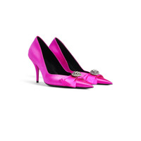 Avenue Palazzo 90mm Pump in fuchsia satin and rhinestones PRODUCT DETAILS • Viscose and silk • Pump • Elongated pointed toe • 90mm arch • Knife heel • Ribbon and rhinestones jewelry on the upper • Tone-on-tone covered heel • Black sole • Made in Italy Upper: viscose, silk - Sole: calfskin, TPU - Insole: goatskin