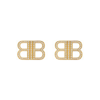 BB 2.0 Earrings in gold aluminium, brass and rhinestones PRODUCT DETAILS • Dimensions : L2,1 x H1,5 x W0,2 inch • Aluminium, brass and glass • Earrings • BB logo with white rhinestones • BB charm at the back closure • For pierced ears • Sold as a pair • Made in Italy • Wipe with a soft cloth Material: 50% aluminium, 30% brass, 20% glass