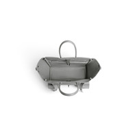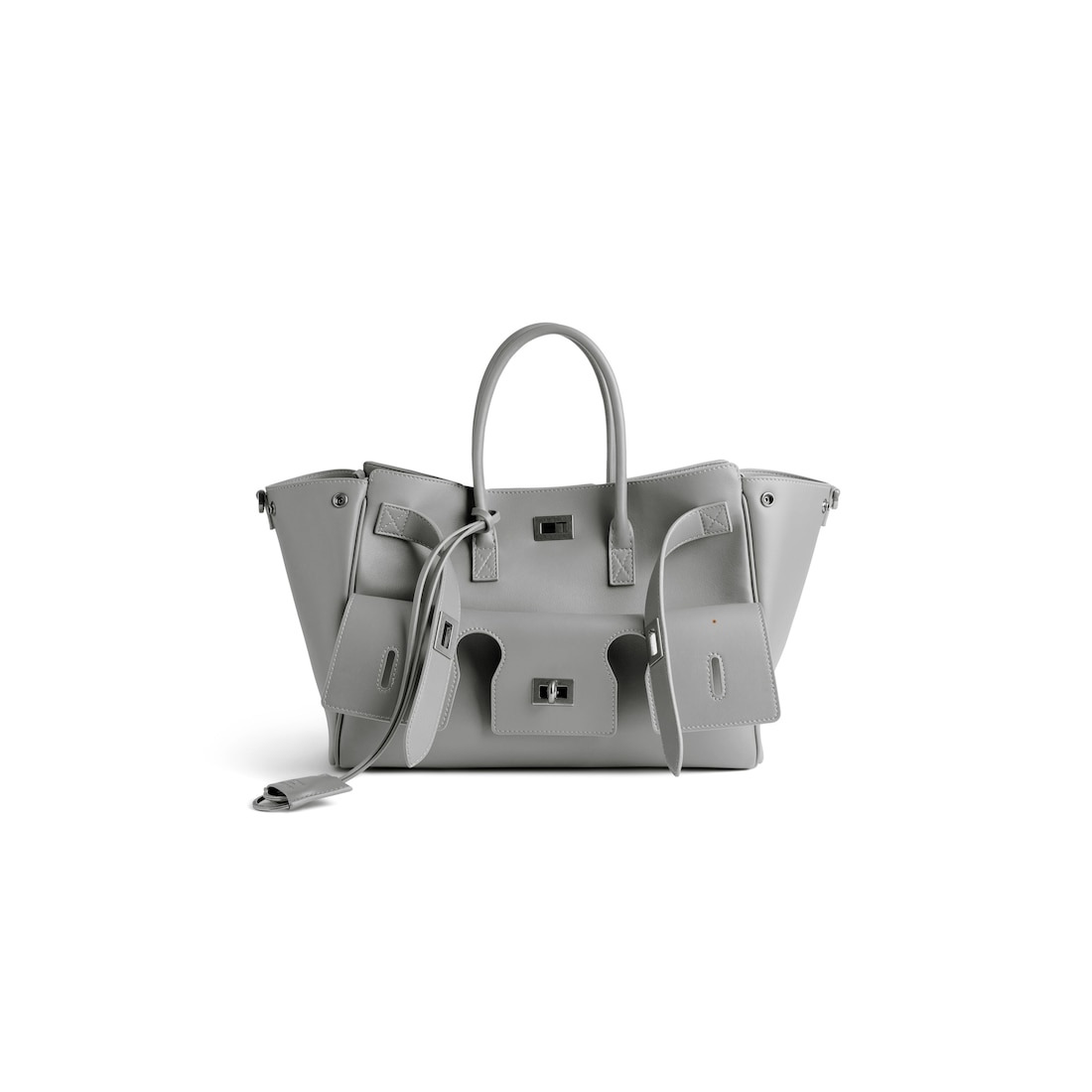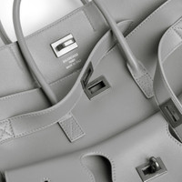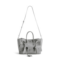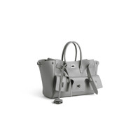 Bel Air Carry All Bag Small in cloud grey smooth calfskin, aged-silver hardware PRODUCT DETAILS • Dimensions: L11,8 x H8 x W4,7 inch • Smooth calfskin • Carry all • Two handles (drop: 6,7 inch) • Adjustable and removable strap (drop: 20,4 inch) • Shoulder, crossbody and hand carry • Balenciaga Paris logo debossed with foil at back • Removable cloche cles with two split rings • Aged-silver hardware • Side snaps • Turn lock closure • Logo engraved on the closure system • Wide front pocket • 1 main compartment • 2 inner zipped pockets • 2 inner flat pockets • Nappa lambskin bonded lining • Made in Italy Material: calfskin