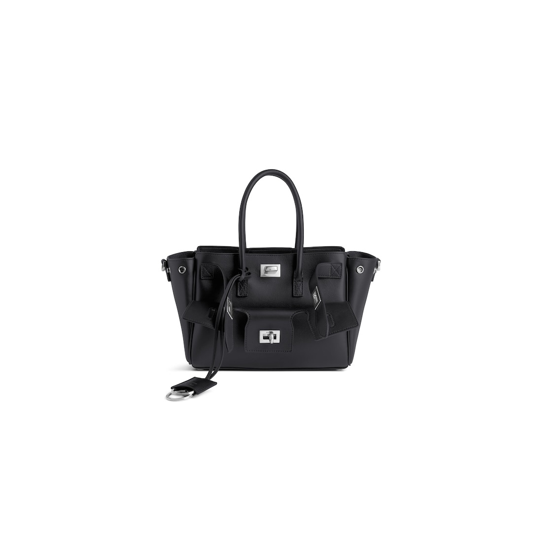Bel Air Mini Carry All Bag in black smooth calfskin, aged-silver hardware PRODUCT DETAILS • Dimensions: L9,2 x H6,7 x W3,1 inch • Smooth calfskin • Carry all • Two handles (drop: 4,3 inch) • Adjustable and removable strap (drop: 17,3 inch) • Shoulder, crossbody and hand carry • Balenciaga Paris logo debossed with foil at back • Removable cloche cles with two split rings • Aged-silver hardware • Side snaps • Turn lock closure and belts to close the front part • Logo engraved on the closure system • Wide front pocket • 1 main open compartment • 2 inner zipped pockets • Nappa lambskin bonded lining • Made in Italy Material: calfskin