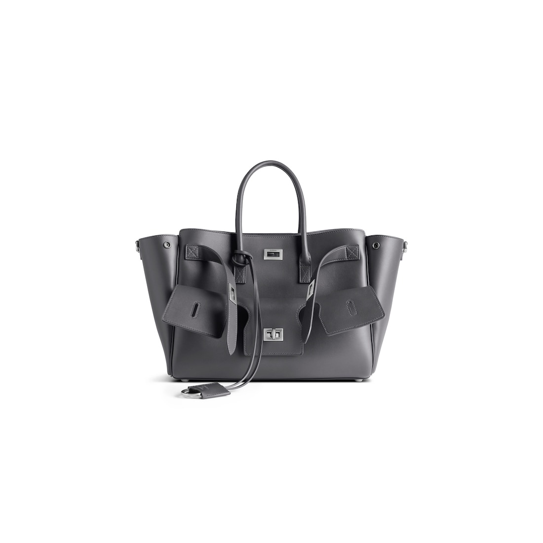 Bel Air Small Carry All Bag in grey smooth calfskin, aged-silver hardware PRODUCT DETAILS • Dimensions: L11,8 x H8 x W4,7 inch • Smooth calfskin • Carry all • Two handles (drop: 6,7 inch) • Adjustable and removable strap (drop: 20,4 inch) • Shoulder, crossbody and hand carry • Balenciaga Paris logo debossed with foil at back • Removable cloche cles with two split rings • Aged-silver hardware • Side snaps • Turn lock closure and belts to close the front part • Logo engraved on the closure system • Wide front pocket • 1 main compartment • 2 inner zipped pockets • 2 inner flat pockets • Nappa lambskin bonded lining • Made in Italy Material: calfskin